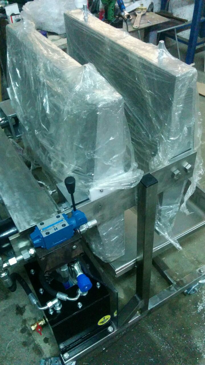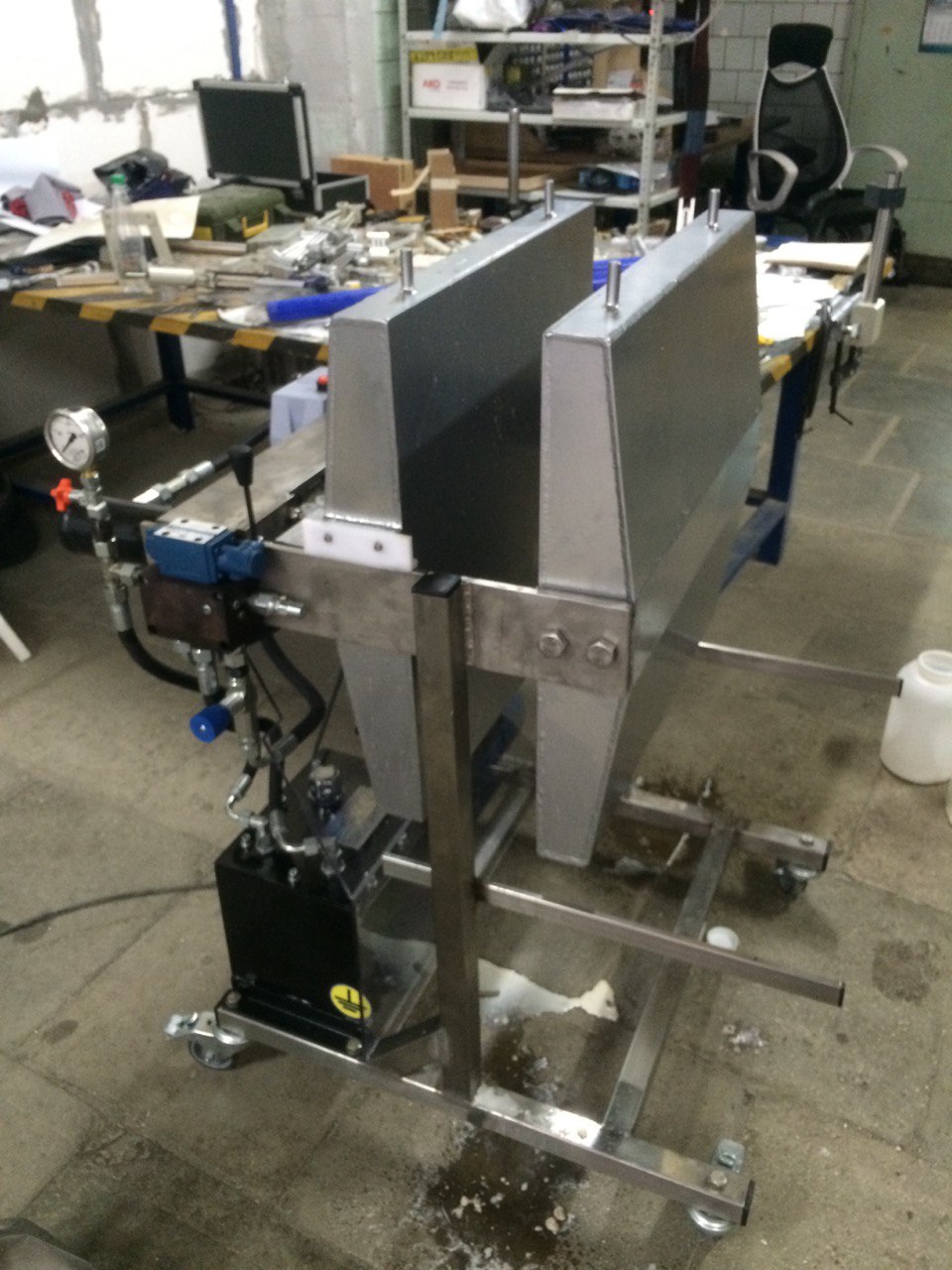 При производстве оборудования для пищевого производства одним из важнейших требований является применение нержавеющей стали марки AISI 304. С помощью данного оборудования заказчик исключил ручной труд в процессе отжима смеси для получения миндального молока. После согласования модели с заказчиком была приобретена гидравлическая система, сварена рама пресса, а также губки пресса с опорной конструкцией внутри, для исключения прогиба рабочей плоскости. Были проведены прочностные испытания в среде SolidWorks.